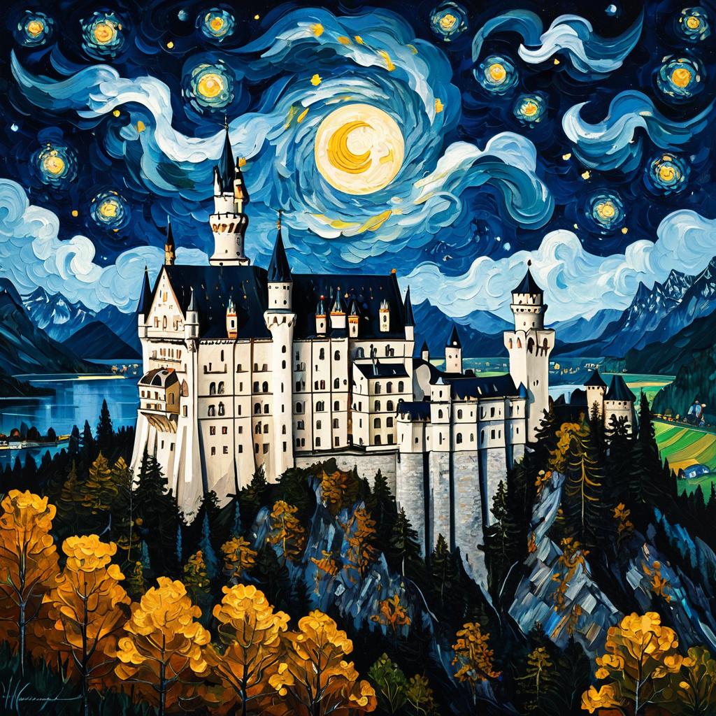 Landscape oil painting of the Leaning Tower of Pisa in the style of Van Gogh's Starry Night. The scene features a vibrant, swirling night sky filled with stars and a soft moonlit glow. The iconic Leaning Tower of Pisa is rendered with intricate architectural details, set against textured clouds and a rich, impasto oil texture. The color palette is vibrant and impressionistic, capturing a majestic and dreamy atmosphere. Painted with bold, swirling brushstrokes and a post-impressionist flair, this high-quality, professional rendering combines Van Gogh-inspired elements with detailed architectural beauty.