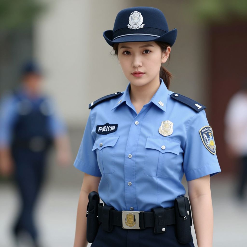 Photograph of an Asian female police officer with light skin and long brown hair, wearing a black helmet with goggles, a black uniform with a "POLICE" patch on the sleeve, and a badge on her chest. She holds a black submachine gun with both hands. Her expression is serious and focused. In the blurred background, another police officer with a similar uniform and helmet is visible, holding a rifle. The background is a bright, out-of-focus outdoor setting. The overall image has a sharp, realistic style with high contrast and vivid colors.