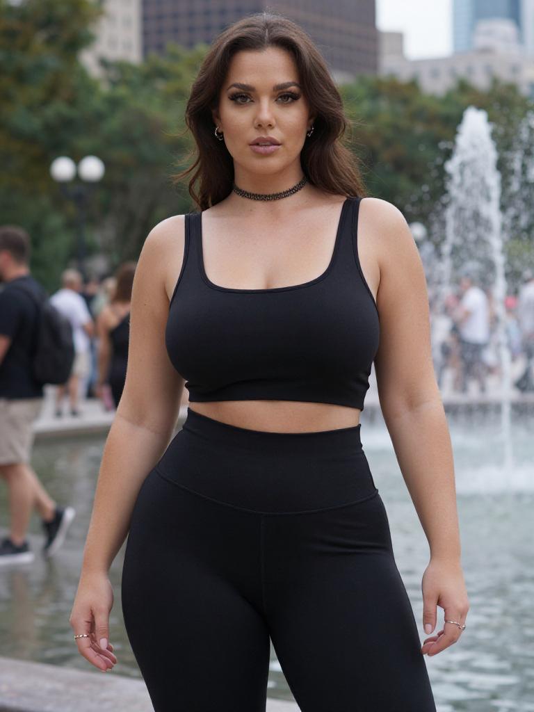 A Plus-size woman in a chic black crop top and high-waisted leggings, adorned with a choker necklace and minimal rings, stands confidently by a bustling city park waterfall, captured in a vibrant cinecolor style. Sexy. Pretty face and beаutiful eyes. Big breasts