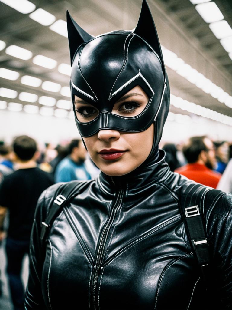 Portrait of a woman wearing a black leather Catwoman costume with a pointed cat-eared mask and dark red lipstick. The background shows a blurred crowd at a comic convention.