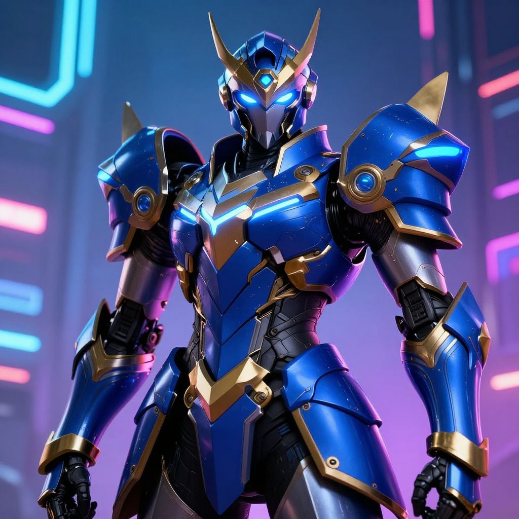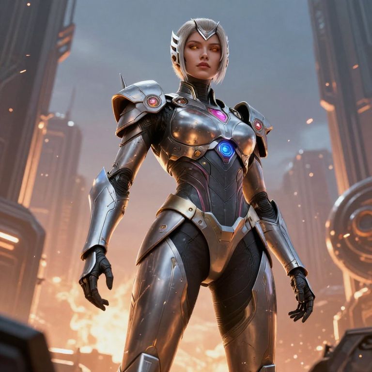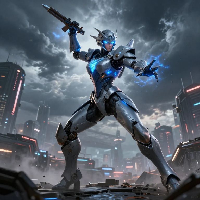 Female primarch in golden mechanized suit, hovering over futuristic city ruins, energy weapon raised, stormy sky, heroic stance, detailed textures, vibrant, dramatic composition