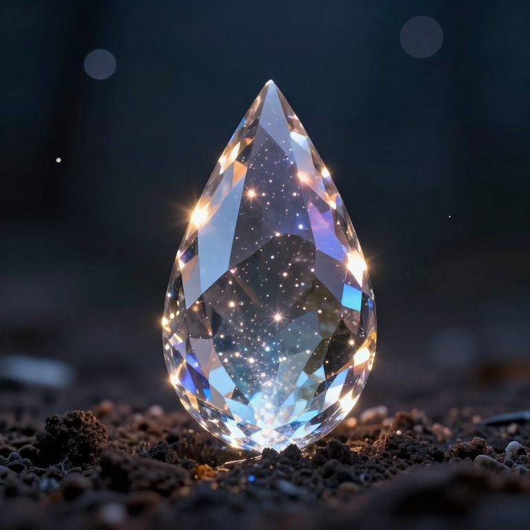 A luminous, crystalline teardrop emerges from the earth, its facets refracting a cosmic glow that dances like stars against a backdrop of bokeh-lit night, defying gravity and reality alike.