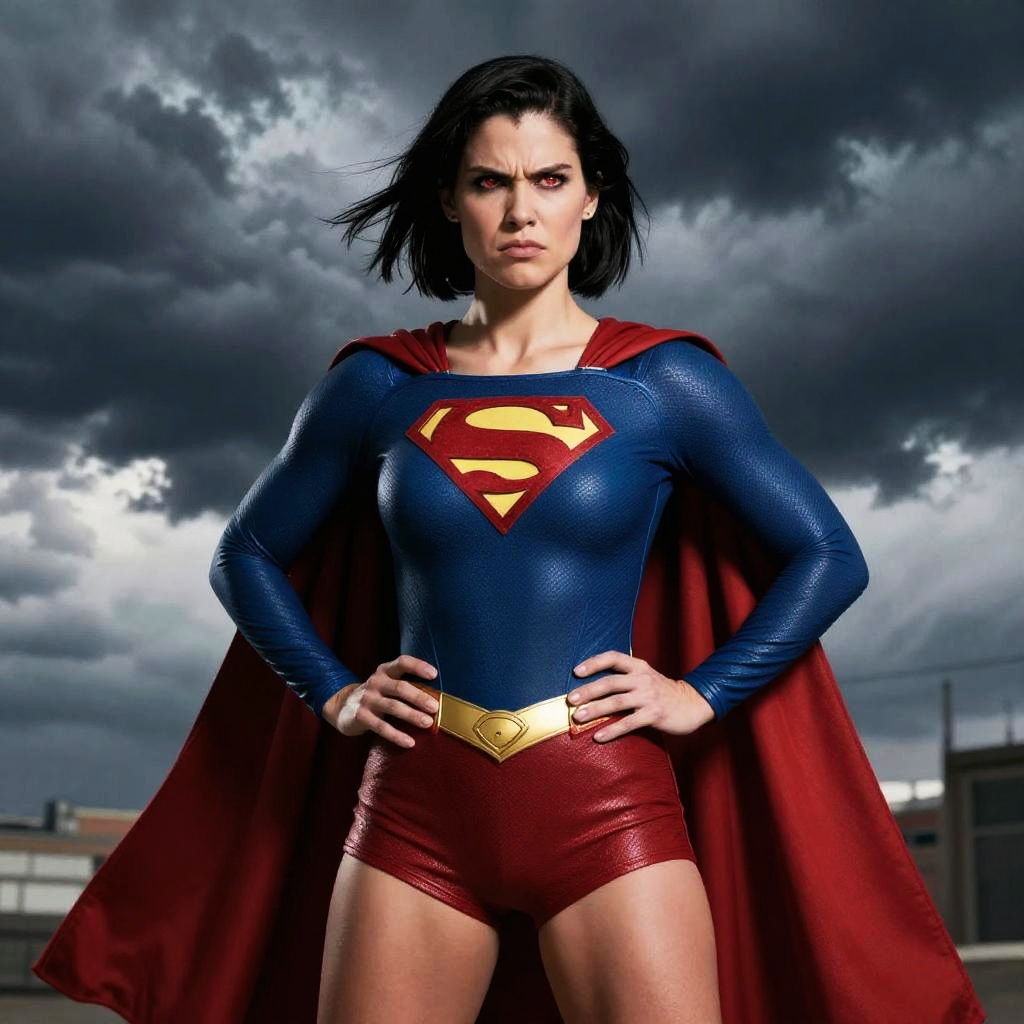 Cowboy shot of supergirl, athletic, short black hair, wide hips, glowing red eyes, cape, angry, storm clouds, realistic