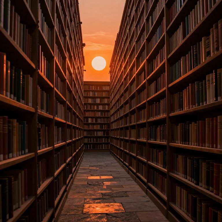 Whispering stone pathways wind between towering bookshelves, illuminated by the glow of a blood-orange sun that casts an ethereal light over the ancient library's secrets.
