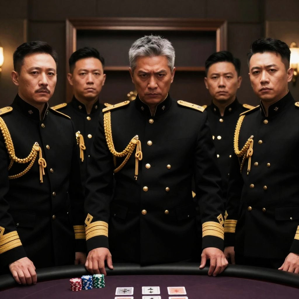 Photograph of a sci-fi scene. A man with a gold mask and black robe faces a man with green armor. Background: metallic grid walls, six warriors in black armor, circular window with hexagonal pattern, central warrior in helmet.