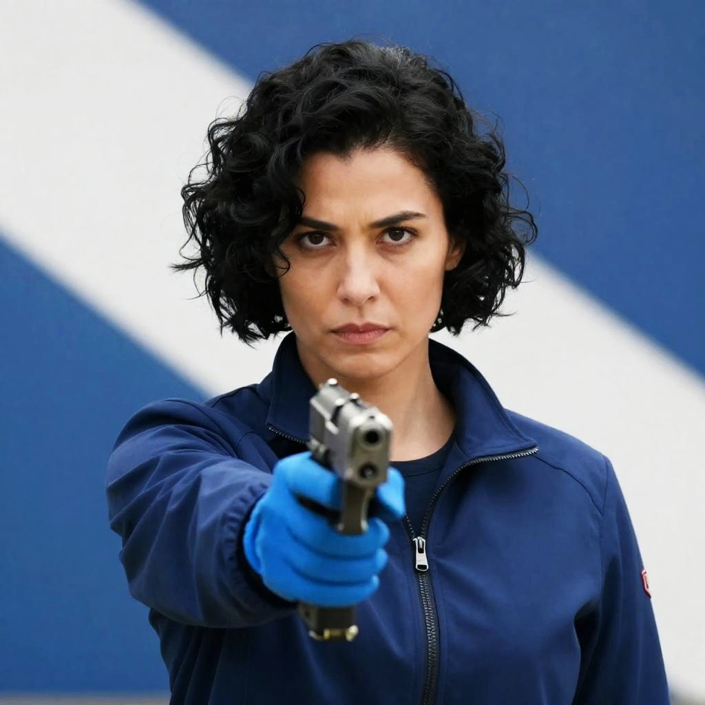 Photograph of a serious woman with short black curly hair, holding a silver handgun with blue gloves. She wears a blue jacket, looking directly at the camera. Background features blue and white diagonal lines. Upper body shot.