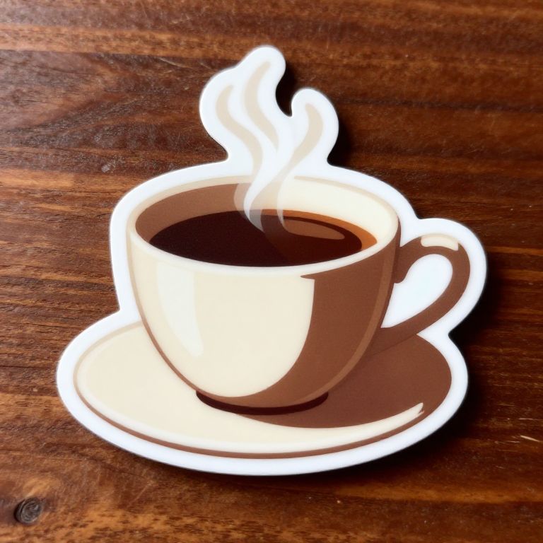 Sticker from photo capturing a steaming cup of coffee on a rustic wooden table, rich browns and creamy whites, outlined with bold white edges and slight gloss, cozy and inviting vibe