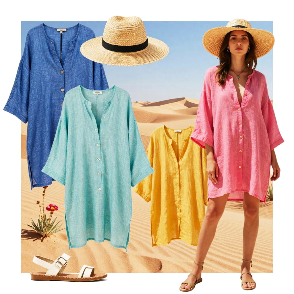 Stylish moodboard collage with a desert summer fashion, featuring loose linen tunics and wide-brimmed straw hats. The background includes sand dunes, desert flowers, and mirages to add a natural touch. The color palette is bold and colorful, with a high-fashion editorial style. Layered images create a cohesive and visually captivating moodboard, blending vibrant colors with carefully curated fashion elements for an inspiring, trend-focused design.