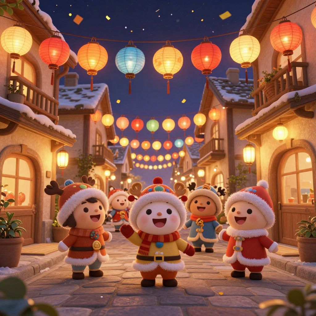 Cartoonhd cozy village street during festival, colorful lanterns hanging between buildings, smiling animated characters in festive costumes, detailed cobblestone streets, warm glowing lights and confetti floating in the air, cheerful and vibrant atmosphere, rich textures