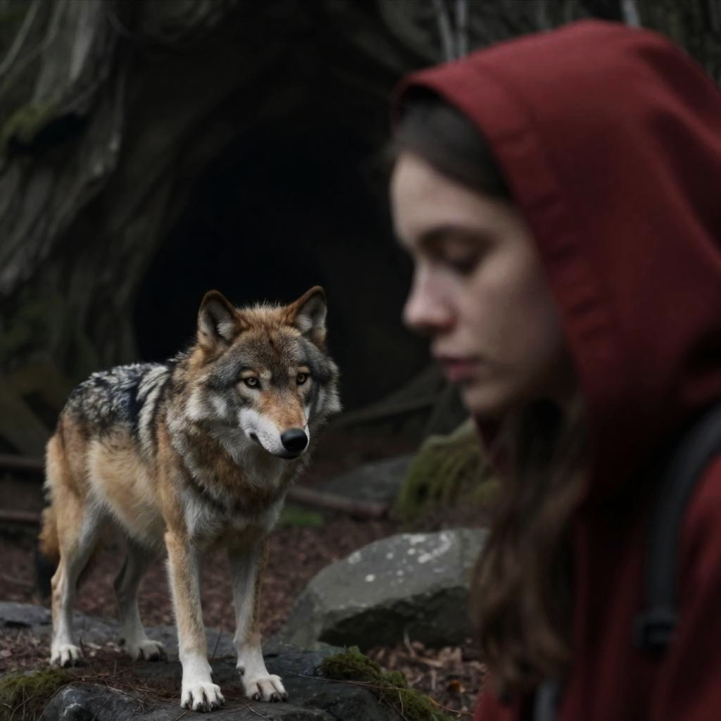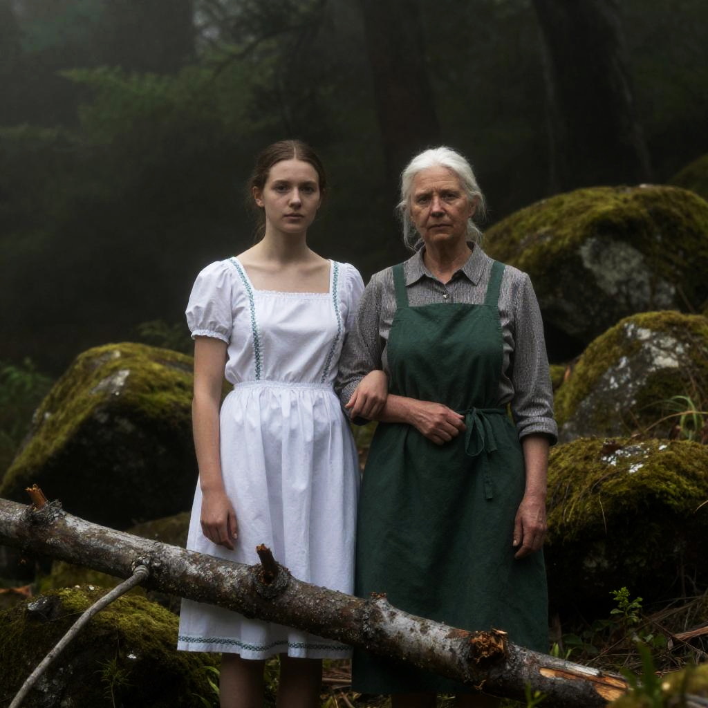 Photograph of two women in a dark, misty forest. One older woman with white hair, green dress, and apron, holds younger woman's arm. Younger woman has brown hair, white dress with green trim. Broken tree branch in foreground. Dense foliage and moss-covered rocks in background. Both women have neutral expressions.