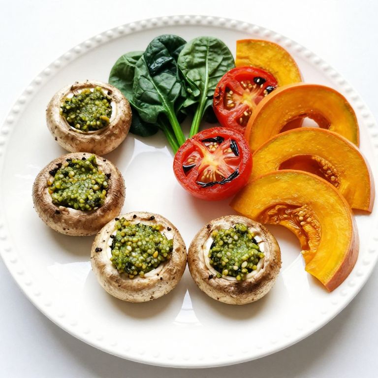 Arrangement of pesto-stuffed mushrooms, vibrant spinach, roasted tomatoes, and pumpkin slices artfully presented on a decorative white plate, showcasing a colorful and nutritious meal.
