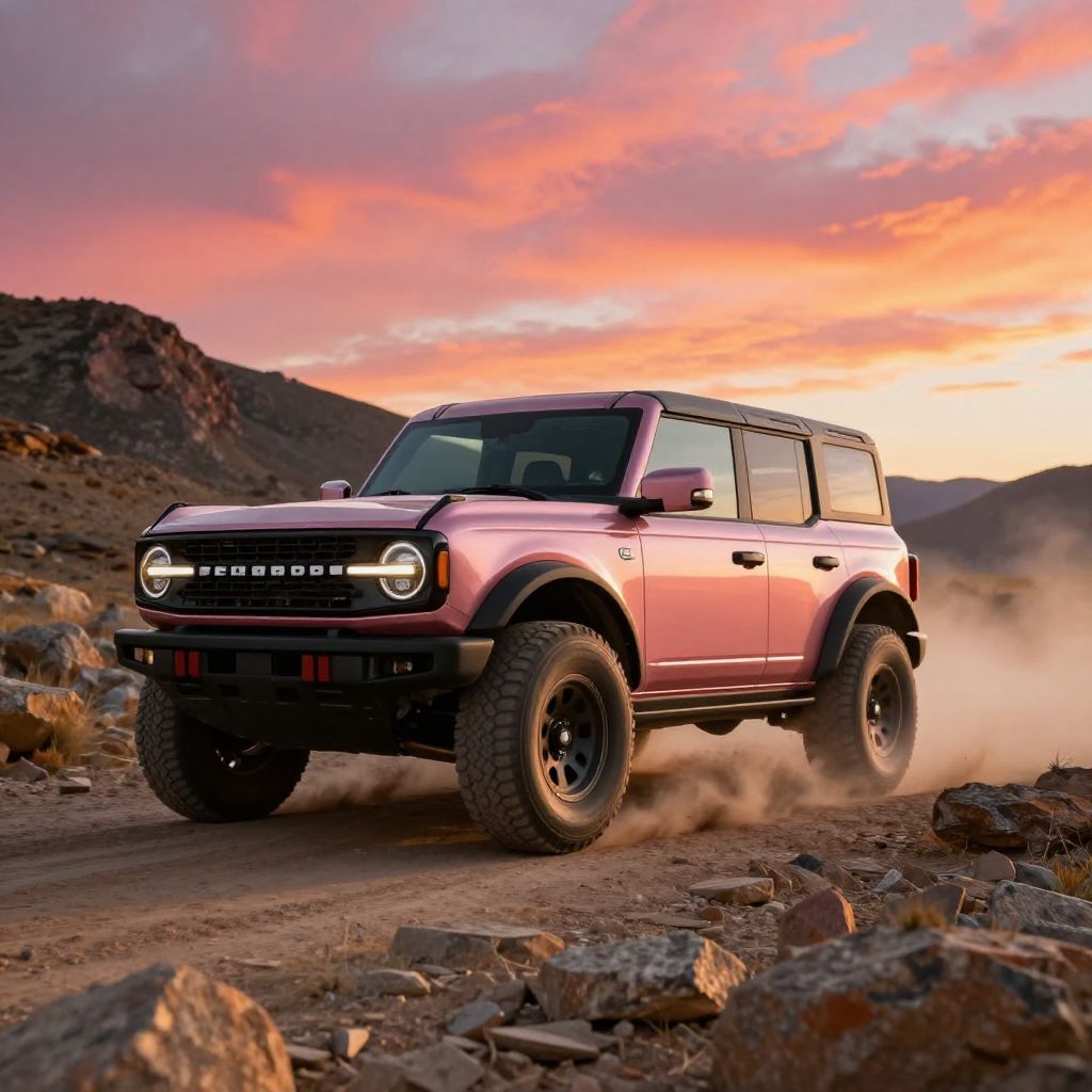 A rose gold Bronco speeding across a rocky mountain pass, dust clouds trailing behind, dramatic golden hour lighting highlighting the vehicle's muscular frame and shiny surfaces, vibrant sky filled with streaks of deep pink and orange.