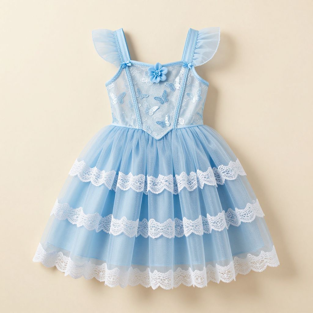 Two-piece aqua dress set featuring a sleeveless polka-dot top with a sheer tulle skirt and a flower embellishment, paired with matching ruffled panties, elegantly displayed on white hangers against a neutral background.