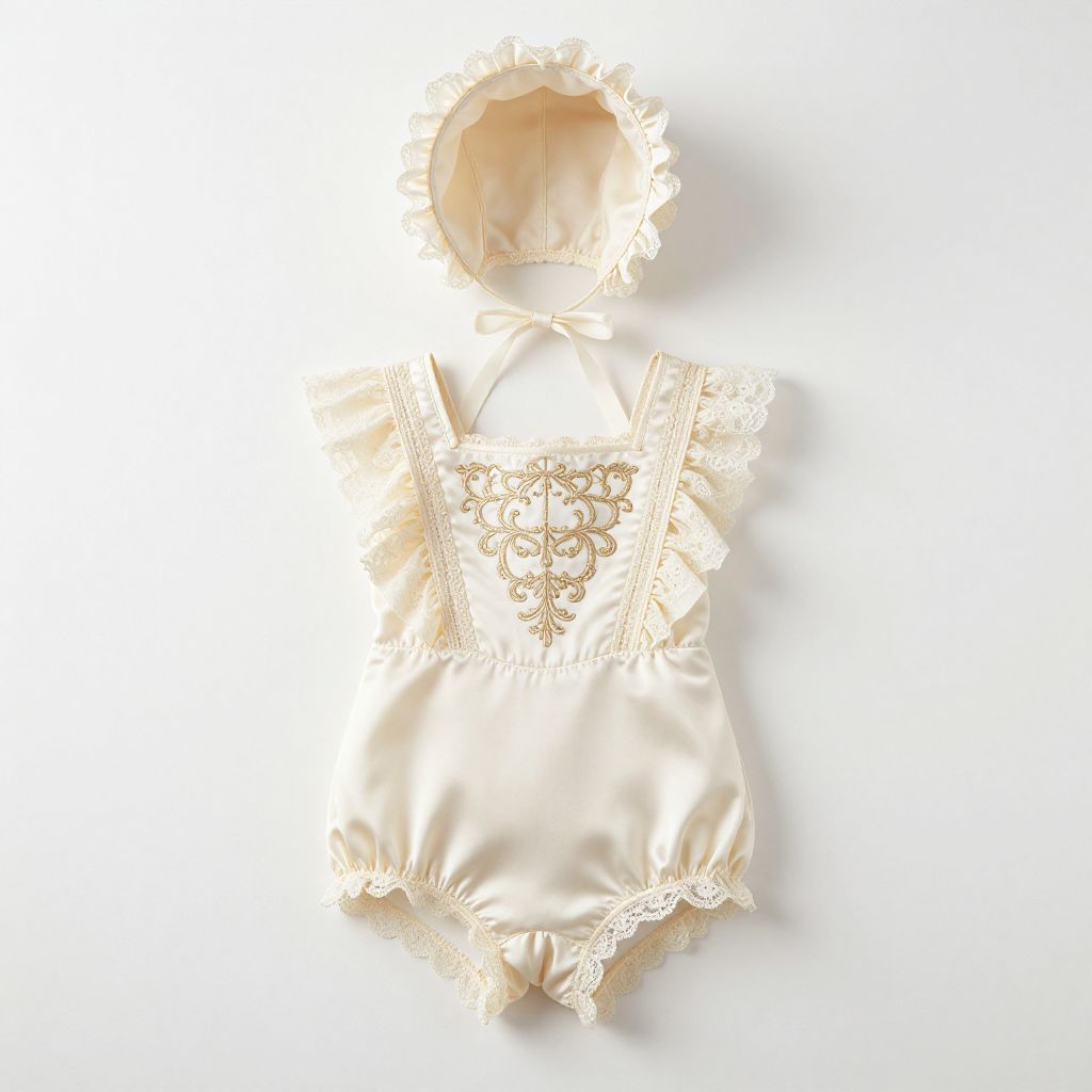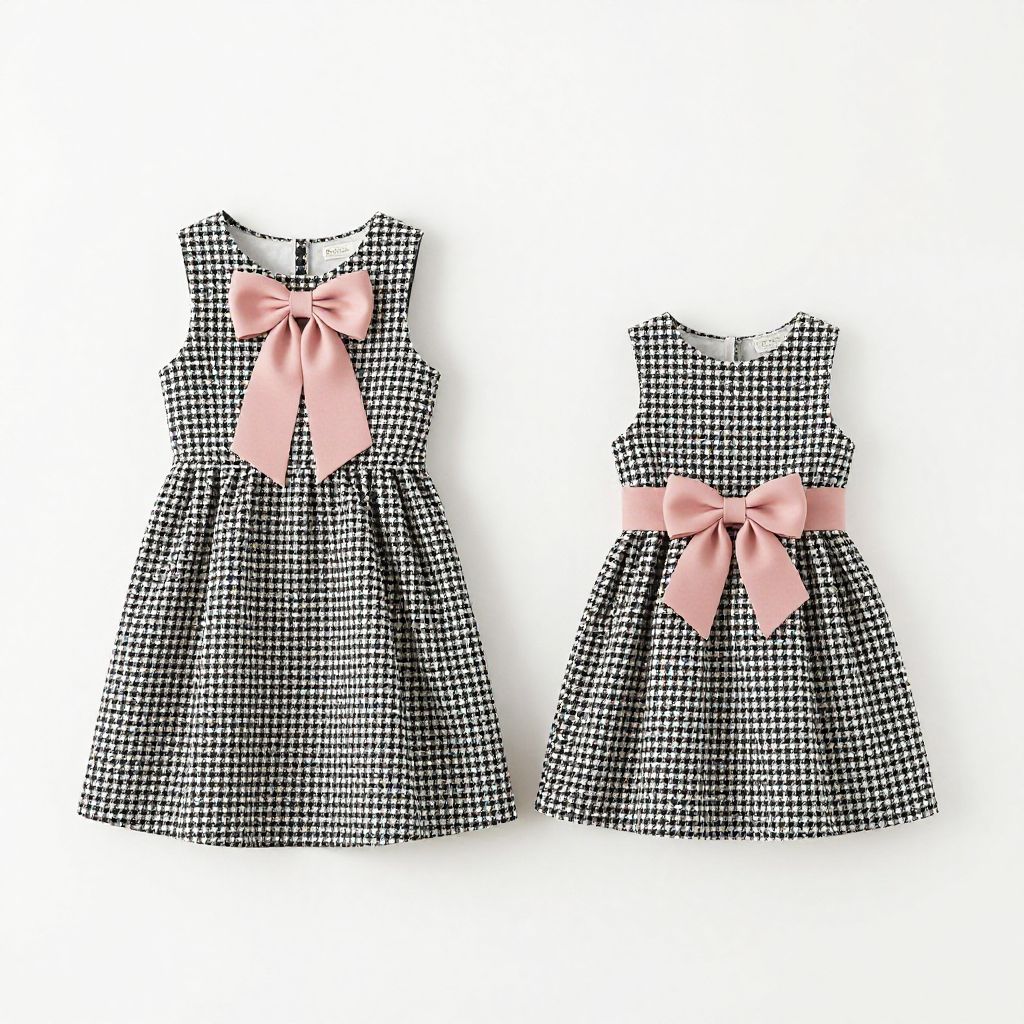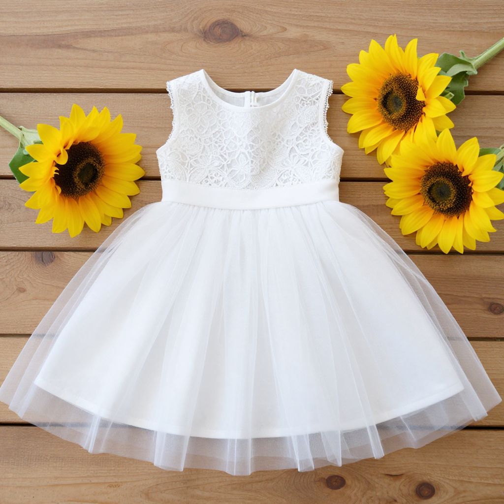 Photograph of a baby girl's outfit on white hangers against a beige wall. The dress is sleeveless with a round neckline, featuring a sheer, black polka-dotted bodice and a black tulle skirt. A black flower embellishment with a silver center is on the left side. The matching black and white polka-dotted ruffled panties hang to the right. The hangers are simple, white plastic. The image focuses on the delicate, stylish, and slightly whimsical design of the outfit.
