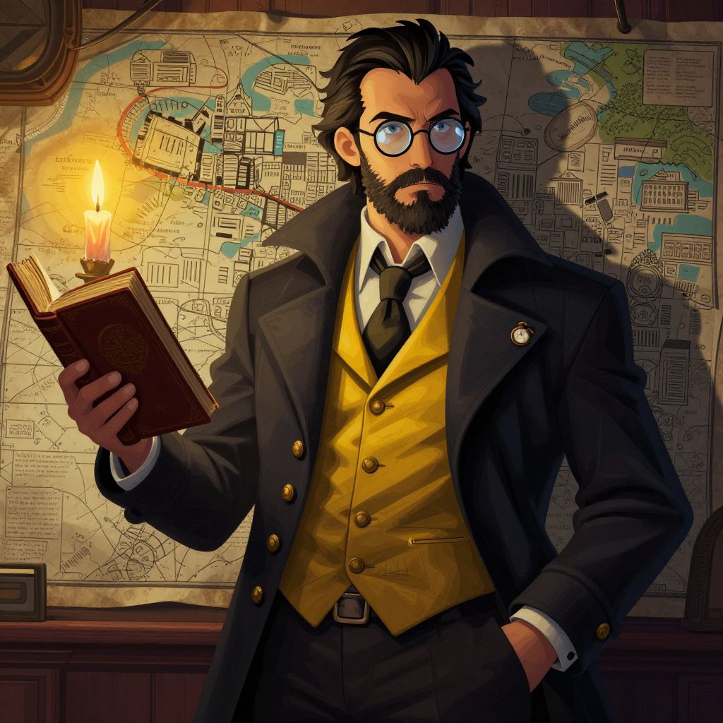 In this image, a man with a beard and glasses is depicted in a dramatic, stylized manner reminiscent of the Disco Elysium game. He is dressed in a dark coat with a yellow vest and a tie, adorned with various buttons and a pocket watch. The man holds a book in his left hand, and a candle illuminates the scene, casting a warm glow. The background features a map with a cityscape, and the overall composition is rich with dynamic textures and colors, creating a sense of depth and atmosphere. The interplay of light and shadow adds to the dramatic effect, highlighting the man's features and the details of his attire. The image is a striking representation of a philosopher or intellectual figure, captured in a visually compelling and evocative style.