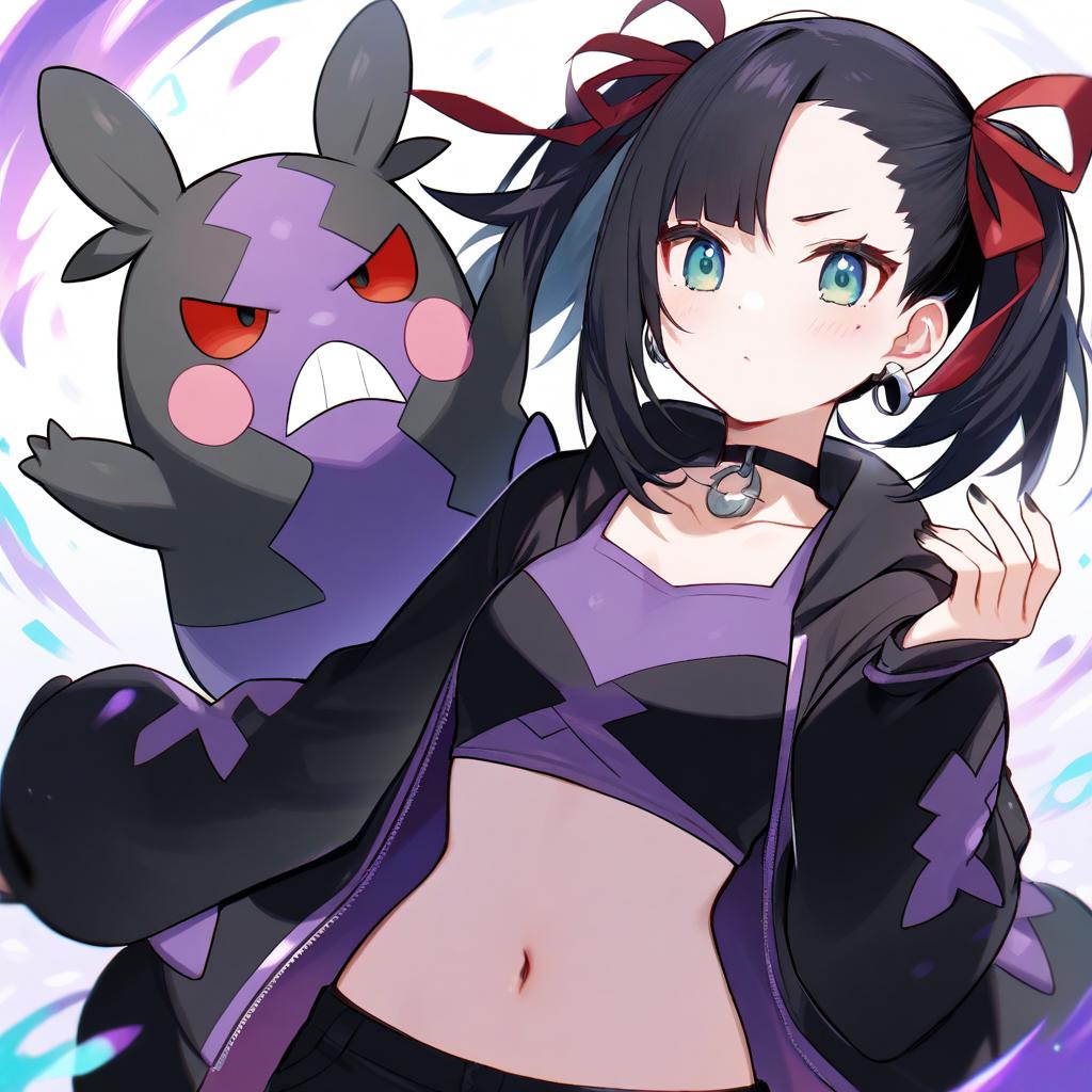 Morpeko (hangry), pokemon, 1girl, hand up, aqua eyes, green eyes, black hair, medium hair, asymmetrical bangs, short twintails, twintails, hair ribbon, small breasts, navel, collarbone, open jacket, black jacket, red ribbon, black choker, long sleeves, black nails, nail polish, earrings, pokemon (creature), stomach, by artist muryotaro, animagine
