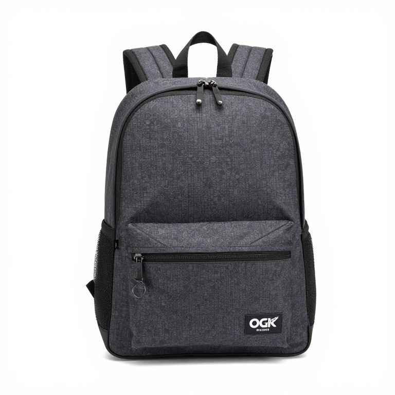 Photograph of a black, textured, rectangular backpack with two side zip pockets, a top zipper, and "OK" logo on the bottom right.