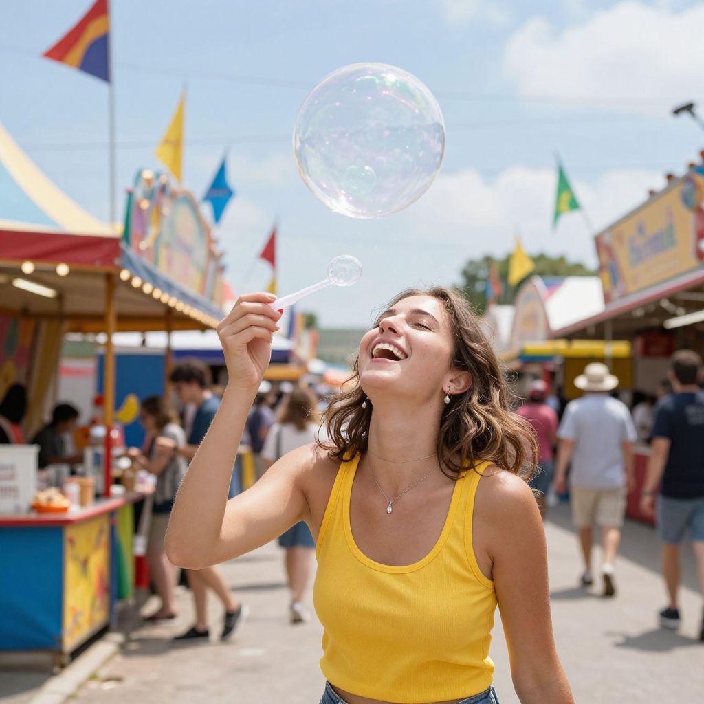 Laughter fills the vibrant carnival as a young woman in a yellow tank top joyfully blows a transparent bubble that floats above her head, surrounded by colorful stalls, festive flags, and a lively crowd enjoying the sunny day.