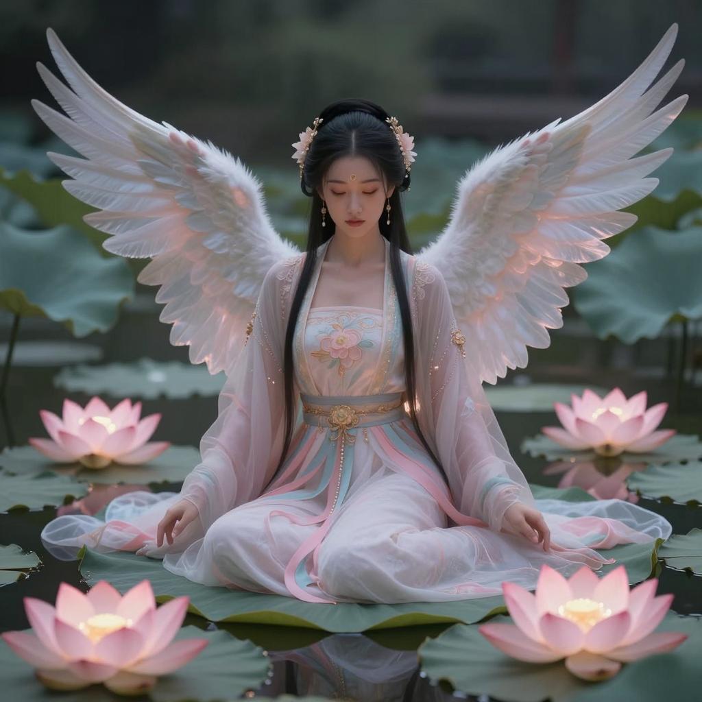 This enchanting digital artwork depicts a mystical woman with delicate wings, seated gracefully on a lily pad surrounded by glowing pink lotus flowers. The ethereal ambiance and soft lighting enhance the enchanting atmosphere, making it a captivating piece of fantasy art.