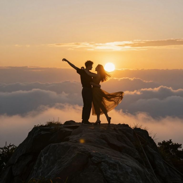 Silhouetted couple on rocky peak, sunset behind, woman's hair flowing, man's arm raised, clouds below, golden-orange sky. Romantic
