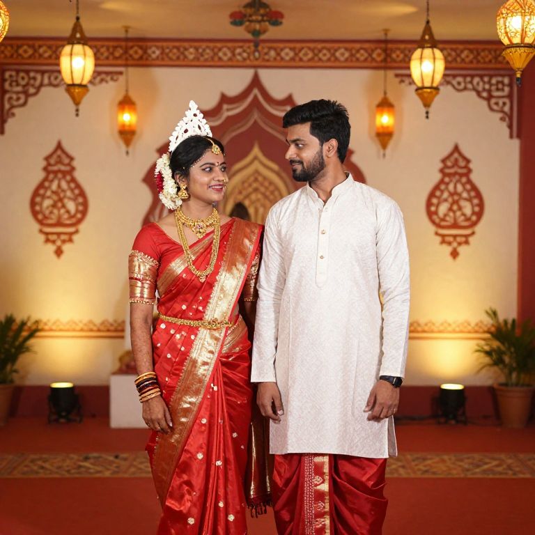 A candid-style realistic photo of a young couple in traditional Telugu wedding attire — the bride in a traditional red cotton saree with gold zari work and a floral crown, and the groom in a white kurta and red lungi — standing in a beautifully decorated wedding hall with hanging lanterns and traditional Telugu motifs painted on the walls.