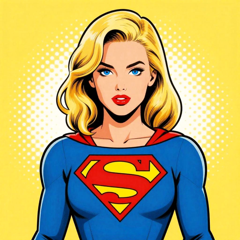 This is a vibrant pop art-style digital drawing of a blonde woman with blue eyes and red lipstick, staring directly at the viewer. She has wavy hair and wears a blue, red, and yellow superhero costume with a bold red "S" on her chest. The background is yellow with black and white halftone dots, adding a comic book feel. Her expression is confident and intense.