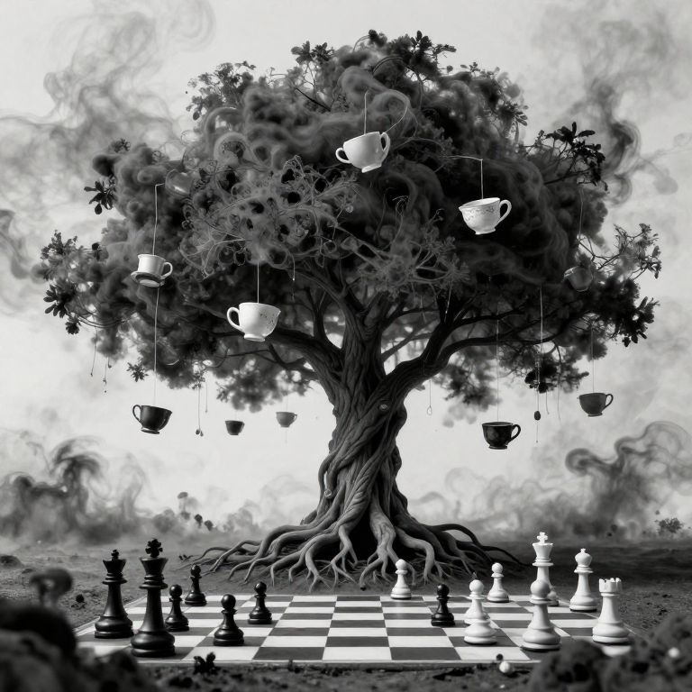 A surreal tree emerges from the ground, its branches adorned with floating teacups suspended by delicate threads, while its roots twist into a battlefield of animated chess pieces, all set against a backdrop of swirling ink clouds.