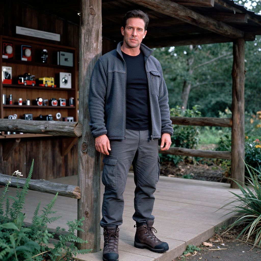 Photograph of a tall, muscular man with short, dark brown hair and light skin, standing under a wooden gazebo. He is wearing a dark gray, textured jacket over a black t-shirt, gray cargo pants, and black lace-up boots. His expression is serious, and he stands with his hands relaxed by his sides. The background features a wooden structure with shelves displaying various small items, including picture frames and collectibles. The setting is outdoors, with greenery and a concrete path visible. The lighting is natural, and the overall mood is calm and rustic.
