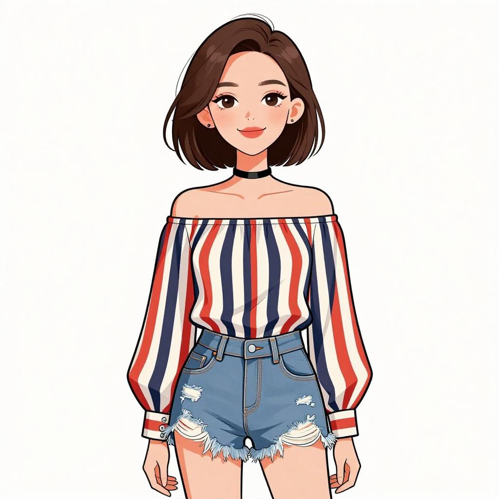 Woman with pretty face and pretty hair. smiling Woman, casual chic, off-the-shoulder blouse with vertical stripes in red, white, and navy, long sleeves with buttoned cuffs, frayed denim shorts with a high waist and distressed details, black choker necklace, white background --sref 1467