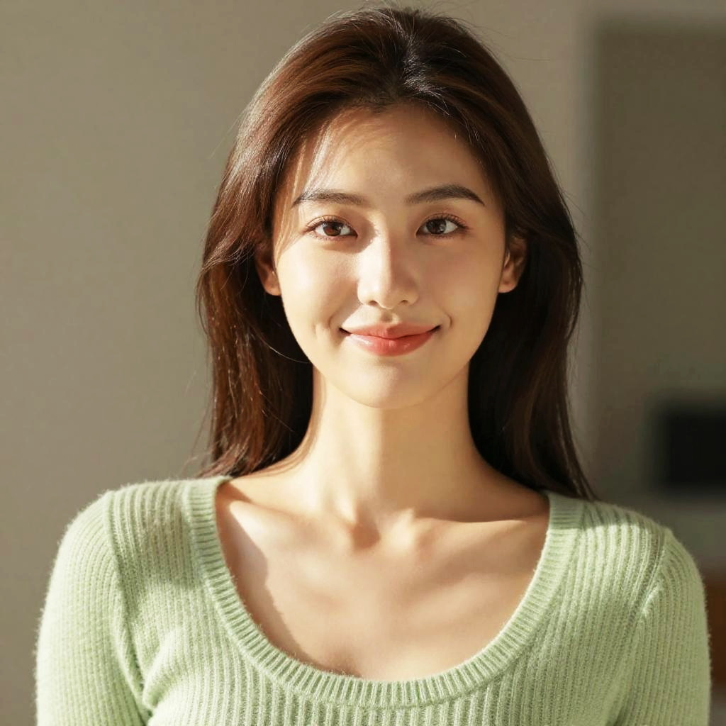Photograph of a young Asian woman with fair skin and a natural, radiant glow. She has straight, medium-length brown hair, parted in the middle, and is wearing a light green, ribbed, scoop-neck sweater. Her brown eyes are slightly tilted upwards, and she has a subtle, confident smile. Soft sunlight illuminates her face from the right, creating a warm, flattering effect. The background is blurred, with neutral tones.