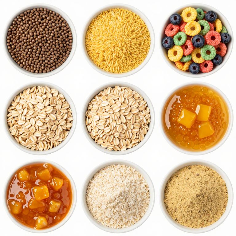 Nine bowls neatly arranged in a 3x3 grid display various ingredients, including round brown pellets, coarse yellow grains, colorful cereal with berries, light beige oats, orange sauce with chunks, and finely ground powder, showcasing a diverse array of textures and colors for oatmeal preparation.