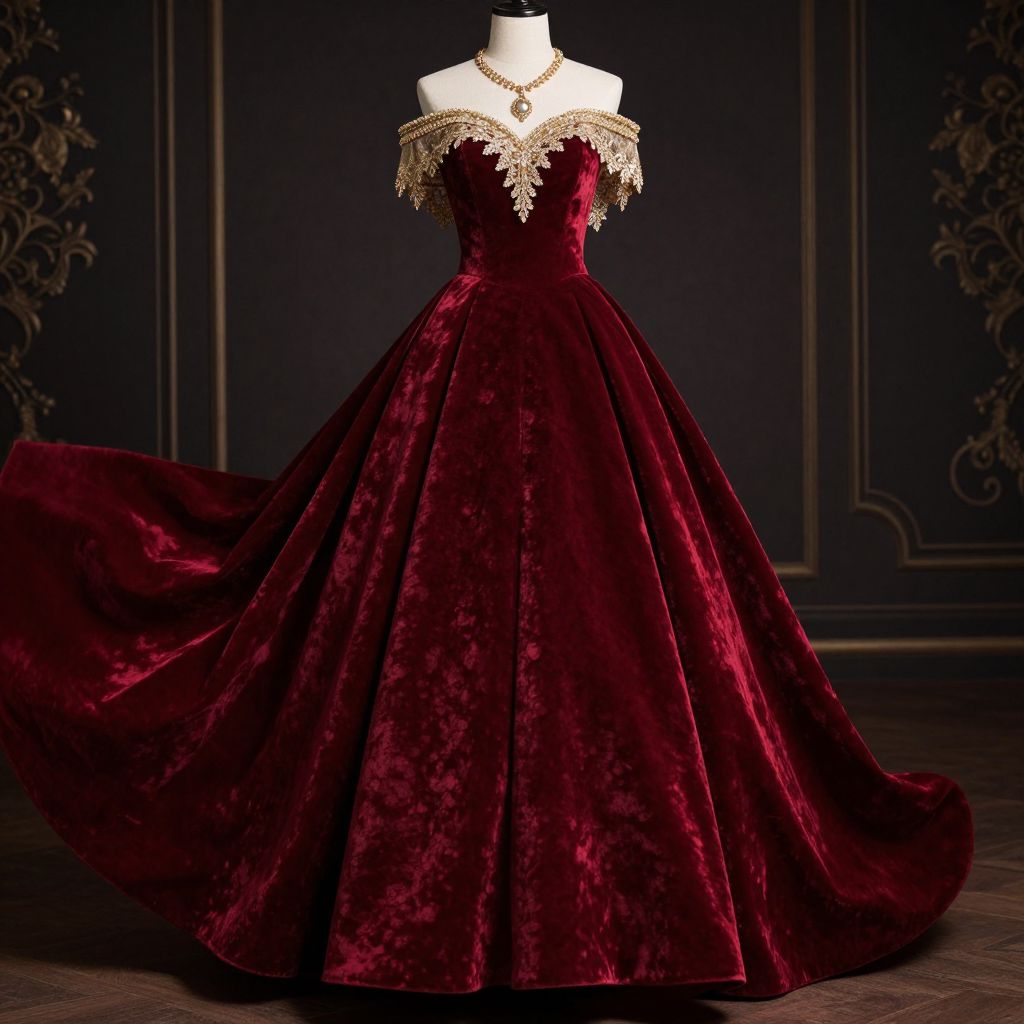 The image showcases a stunning, photorealistic dress with a wine red velvet bodice that fits snugly, accentuating the elegance and sophistication of the wearer. The bodice is adorned with intricate, gold-embellished lace that drapes elegantly over the shoulders, adding a touch of regality and opulence. A delicate gold necklace with a prominent pendant graces the center of the dress, further enhancing its regal appearance. The skirt of the dress is voluminous, composed of layers of rich, wine red velvet that cascades down in a dramatic, flowing manner, creating a sense of movement and grandeur. The overall design is haute couture, with meticulous attention to detail and a harmonious blend of textures and colors, capturing the essence of a princess or a high-society figure. The dress is displayed against a dark, ornate background, which contrasts beautifully with the vibrant red of the velvet, making the dress the focal point of the image.