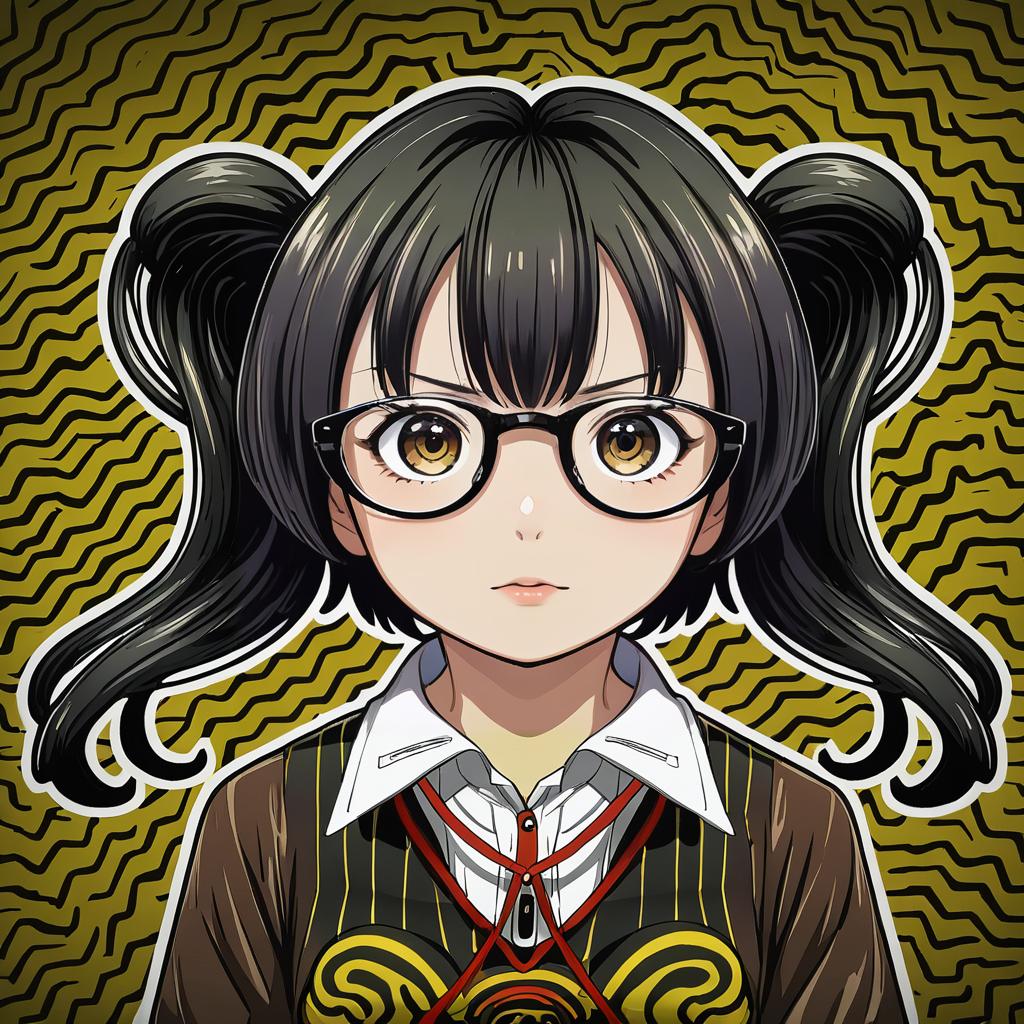 Anime-style illustration of a young girl with short black and brown hair tied in twintails, wearing round glasses. She is dressed in a brown outfit with a white collar and a patterned vest featuring yellow stripes and creative designs. The background has a yellowish pattern with wavy black lines.