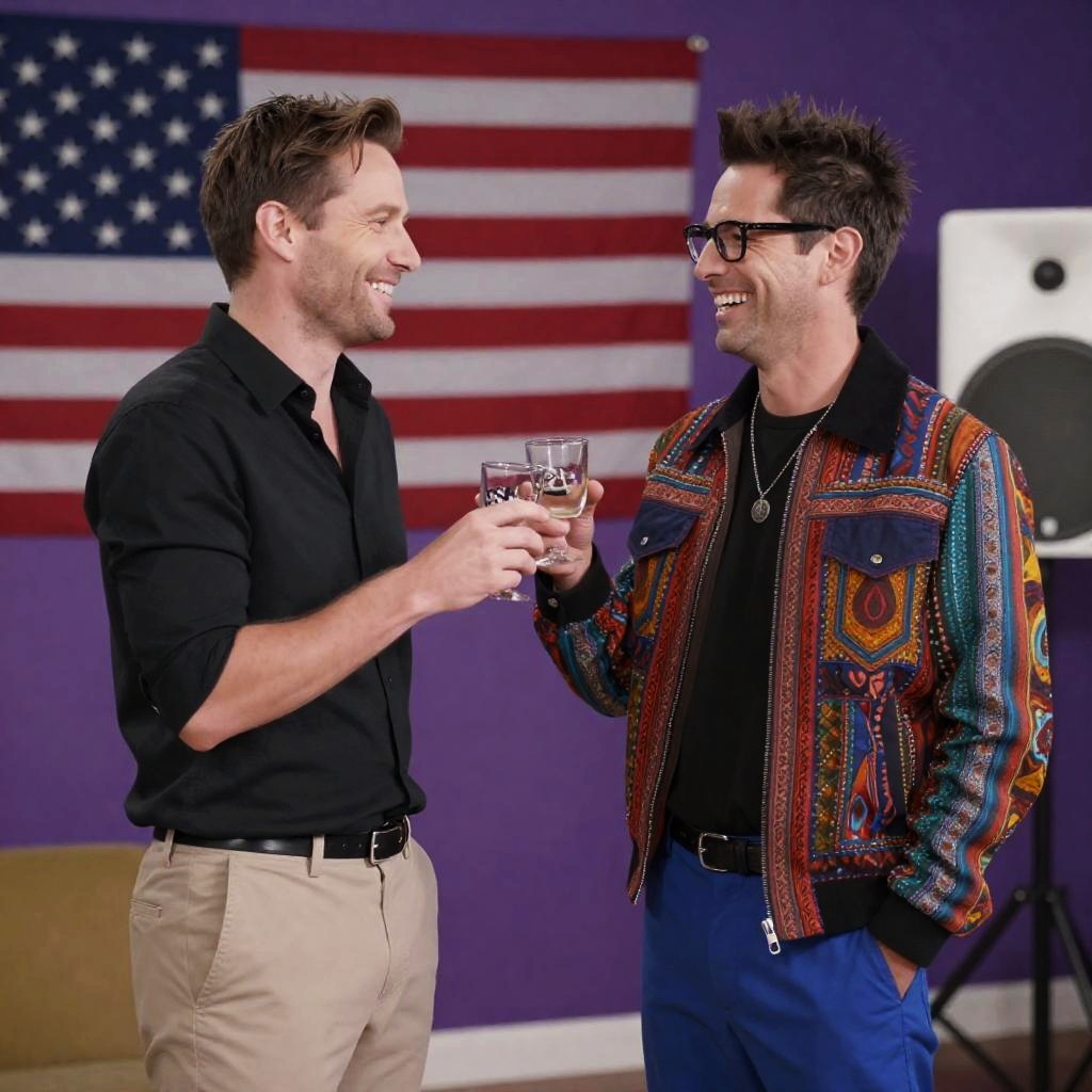 Photograph of two men. Man on left in black shirt, beige pants, short brown hair, smiling, clinking glasses with man on right. Man on right in colorful, patterned jacket, blue pants, glasses, spiky brown hair, smiling. Purple wall, American flag, white speaker in background. Both standing, holding glasses, laughing.