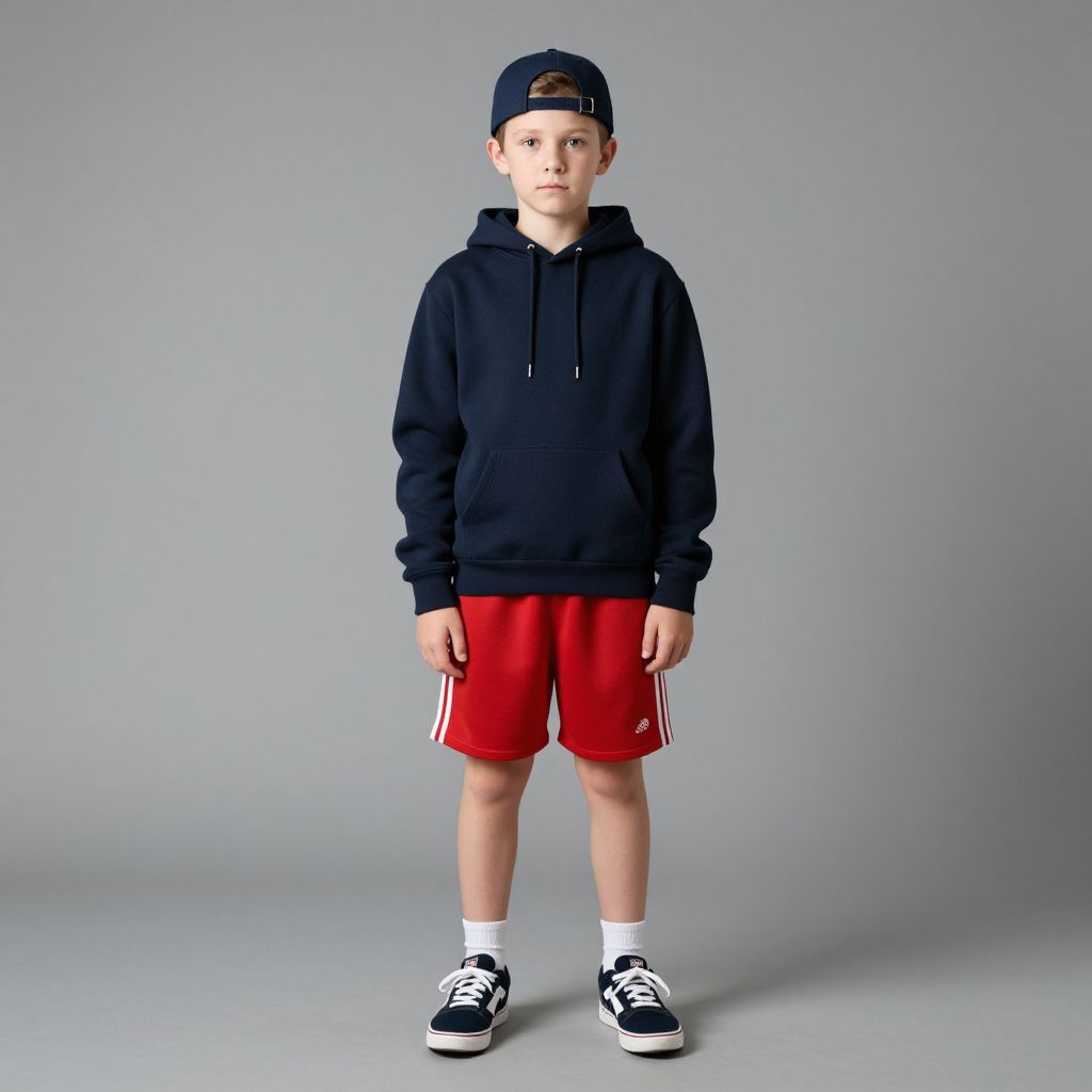 Man sports clothing costume, 1boy, male focus, solo, hat, baseball cap, shoes, full body, shorts, red shorts, sneakers, standing, hood, looking at viewer, parody, hoodie, realistic, backwards hat