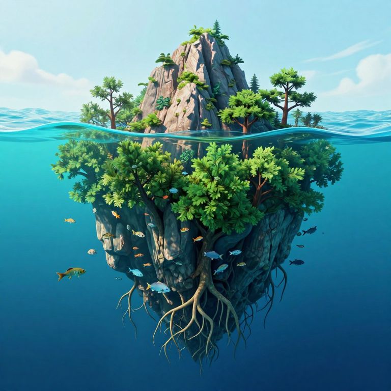 A surreal 3D-rendered scene depicts an inverted mountain peak floating in the ocean, where lush green trees grow roots upward toward the water's surface, creating a fantastical underwater landscape as fish gracefully swim among the foliage and roots.