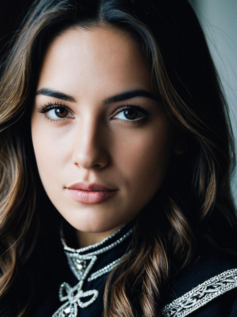 Woman in Mariah Mallad costume, photorealistic close-up headshot