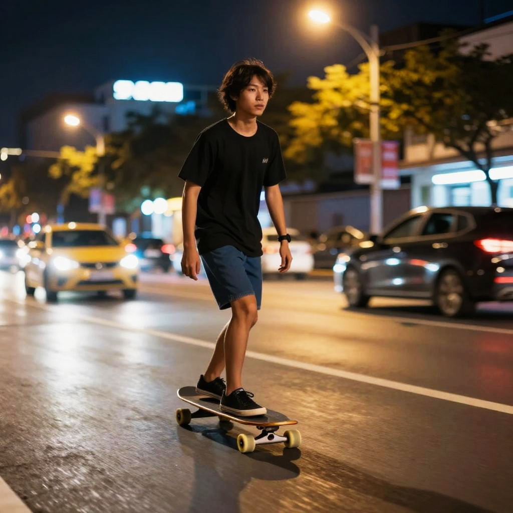 Photograph of a young Asian man with curly black hair, wearing a black t-shirt and blue shorts, skateboarding on a wet urban street at night. He is in mid-motion, with a focused expression, and is wearing black sneakers with white soles. The street is illuminated by streetlights and blurred car headlights, with buildings and trees in the background. His skateboard has a black deck and white wheels. The scene has a dynamic, urban nightlife feel, with reflections on the wet pavement. The background includes bright, neon signs and a few parked and moving cars.