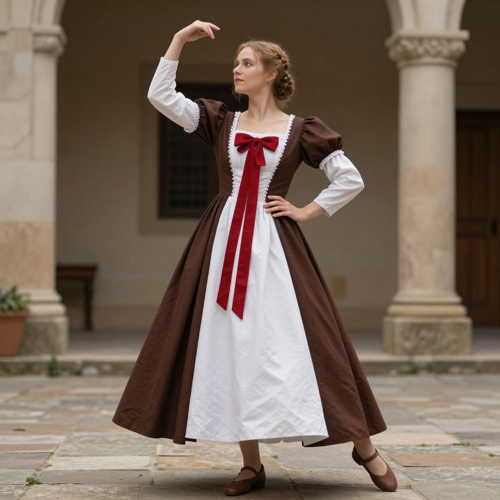 Medieval Dance Costume, woman in a brown and white dress with a red bow