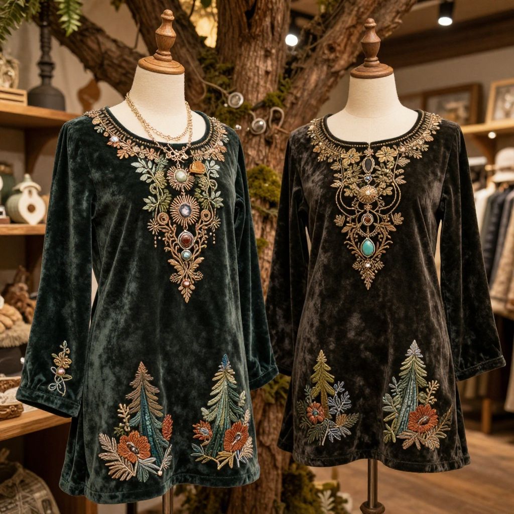 Two boutique elves outfit displayed on elegant mannequins in a rustic woodland boutique, showcasing handcrafted velvet tunics, intricate nature-inspired accessories, fine embroidery with forest motifs, soft moss and bark textures, warm golden lighting, fantasy elegance.