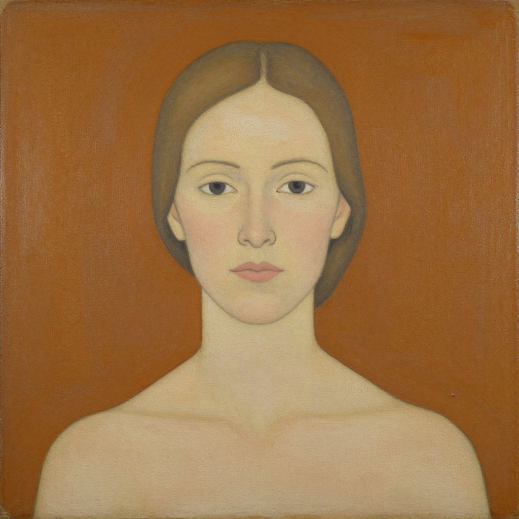 This is a photograph of a painting in a realistic style. The portrait features a young woman with fair skin and short, brown hair parted in the middle. She has a neutral expression with slightly downturned lips and dark, almond-shaped eyes. Her shoulders are bare, suggesting she is not wearing a shirt. The background is a solid, warm reddish-brown color, providing a stark contrast to her pale complexion. The painting uses smooth, even brushstrokes and subtle color gradations, giving it a serene and minimalist appearance. The artist's style is reminiscent of early 20th-century portrait painting.