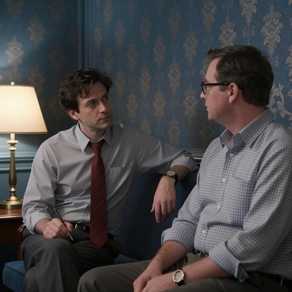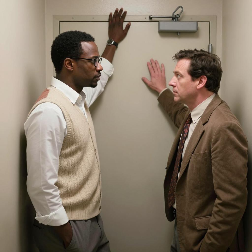 Two men in a narrow, beige-walled hallway. Black man with short hair, glasses, white shirt, beige vest, left arm raised. White man with dark brown hair, brown jacket, patterned tie, right hand gesturing, left hand on door. Black man facing left, white man facing right. Intense expressions. Metal door with latches and hinges in background. Clothing ures: knit vest, patterned tie. Visual style: photograph.