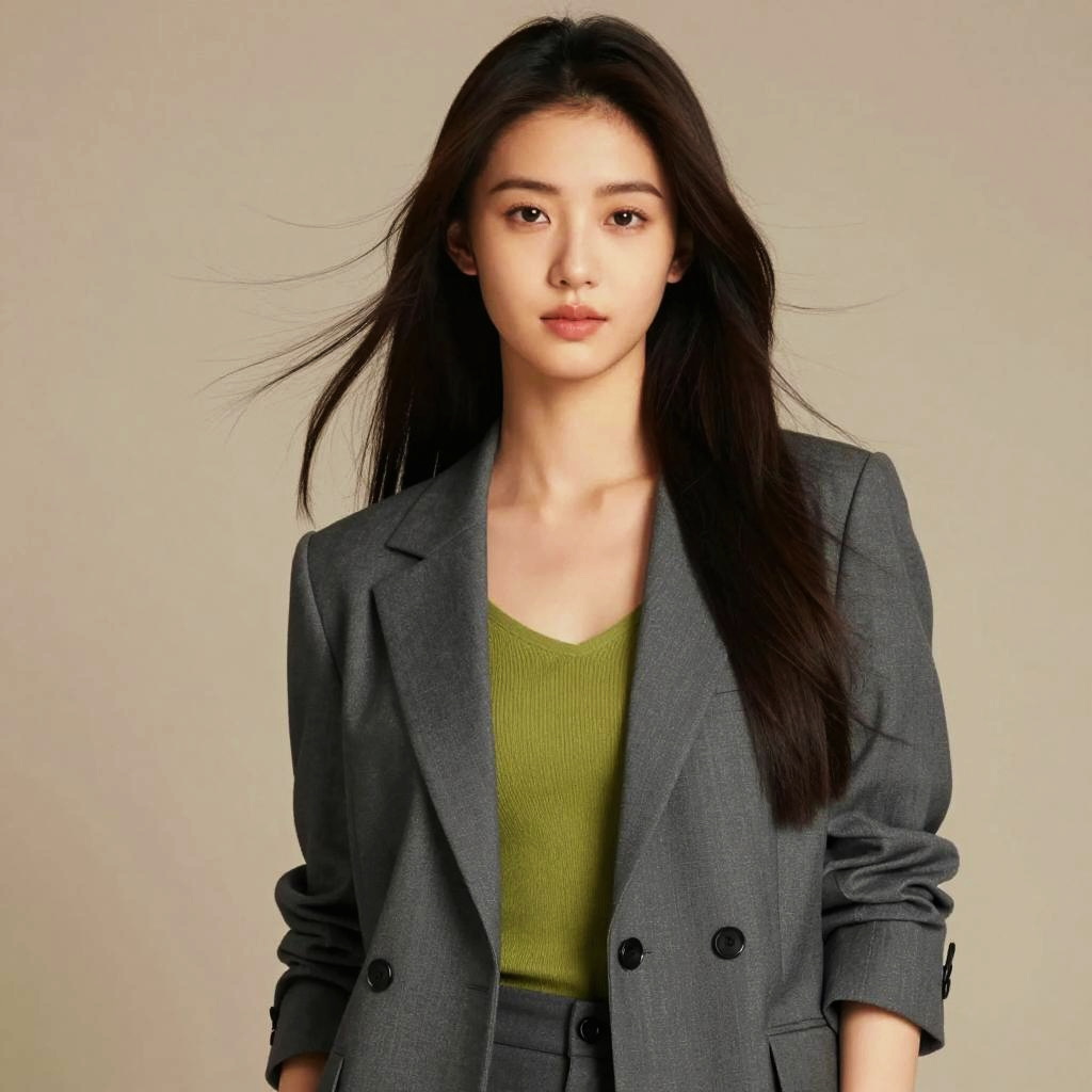 Photograph of an East Asian woman with long, wavy black hair standing against a blurred background of pink and white roses. She has fair skin and wears a shiny, silver satin blouse with a buttoned neckline. Her expression is neutral, with slightly parted lips and soft, natural makeup. The roses have dark green leaves, and the lighting highlights the satin texture of her blouse, creating a gentle contrast with the soft-focus floral background. The overall composition is elegant and serene.