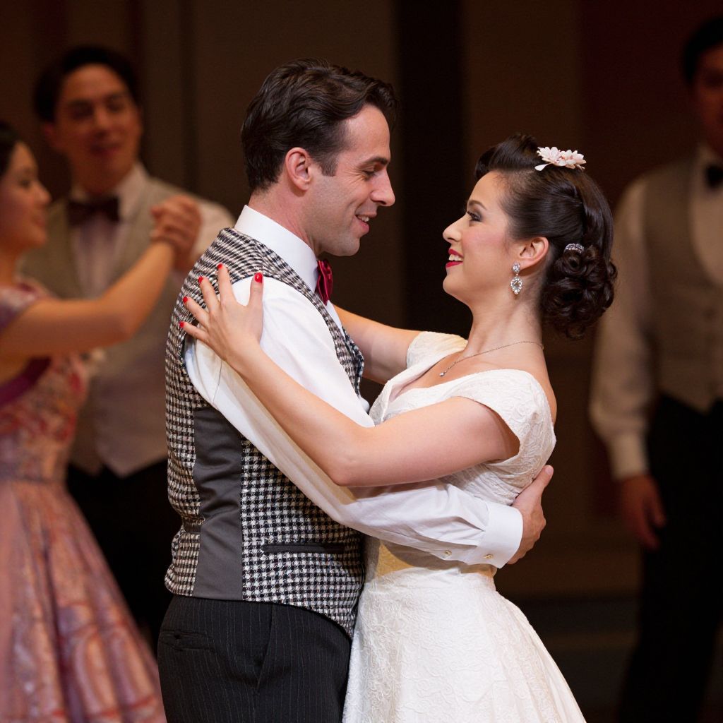 Elegantly dressed performers from *Anything Goes* (2005) share a joyful dance moment, with the man in a checkered vest and red bow tie embracing the woman in a white dress adorned with a floral hair accessory and sparkling earrings.