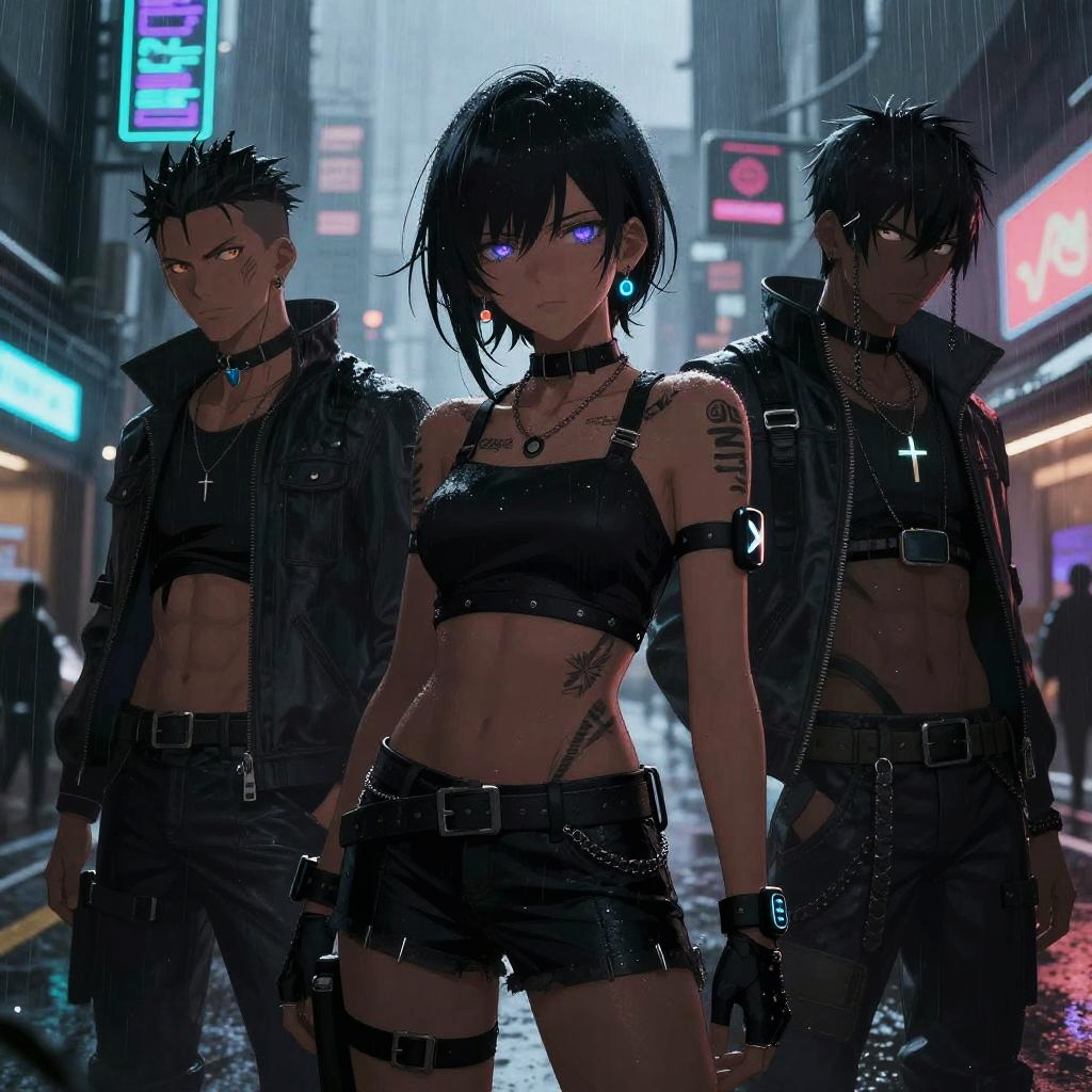 Dark skin anime characters in cyberpunk setting, glowing tattoos and accessories, rain-soaked streets with holograms, intense expressions, sleek futuristic outfits, anime character design
