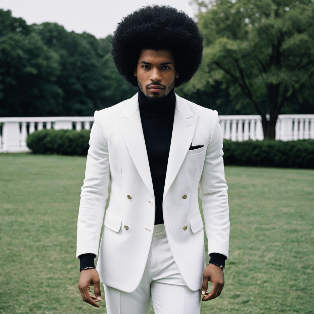 Euphoria party outfit man,realistic, watch, 1boy, male focus, wristwatch, jacket, pants, belt, shirt, solo focus, afro, looking at viewer, brown hair, blurry, night, standing, brown jacket
