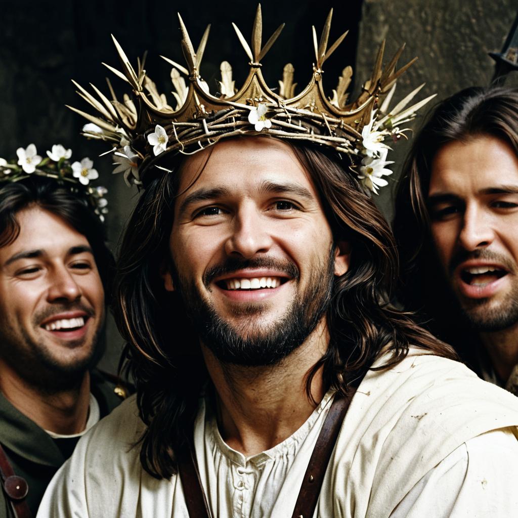 Saint Michael, hopeful and suffering, soldiers and angels, Blooming The Passion of the Christ, crown of thorns, suffering looking face, strong sense of realism, mocking and laugh at jesus christ, in the style of still lifes