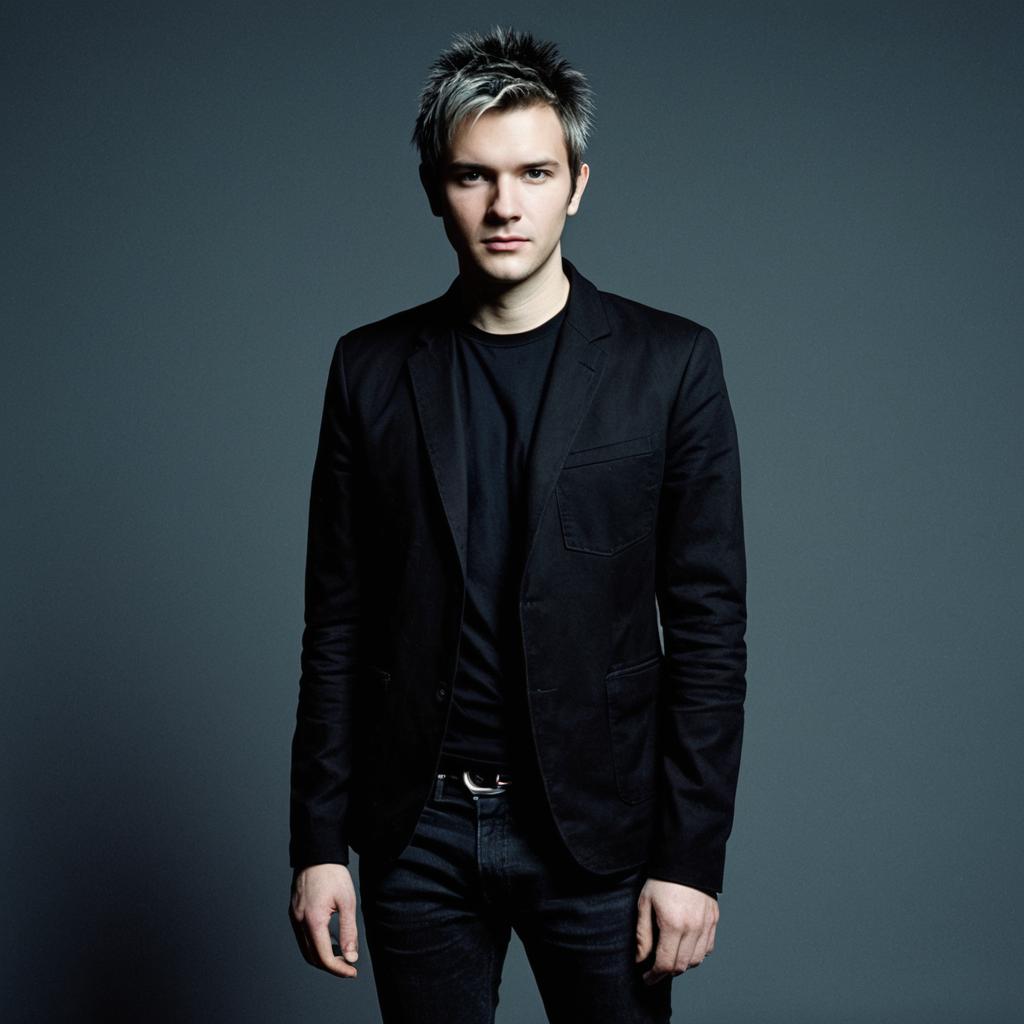 Full body portrait of a slim male model with a simple hairstyle, wearing a black fitted blazer, black crew neck t-shirt, and dark skinny jeans, styled in 1980s post-punk fashion inspired by Joy Division's Peter Hook.