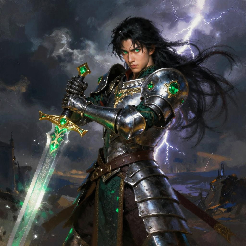 Fantasy warrior with black hair and green eyes, clad in ornate armor with emerald accents, holding a glowing sword, set against a stormy battlefield, dramatic clouds and lightning, heroic pose, painterly style with rich textures and strong lighting