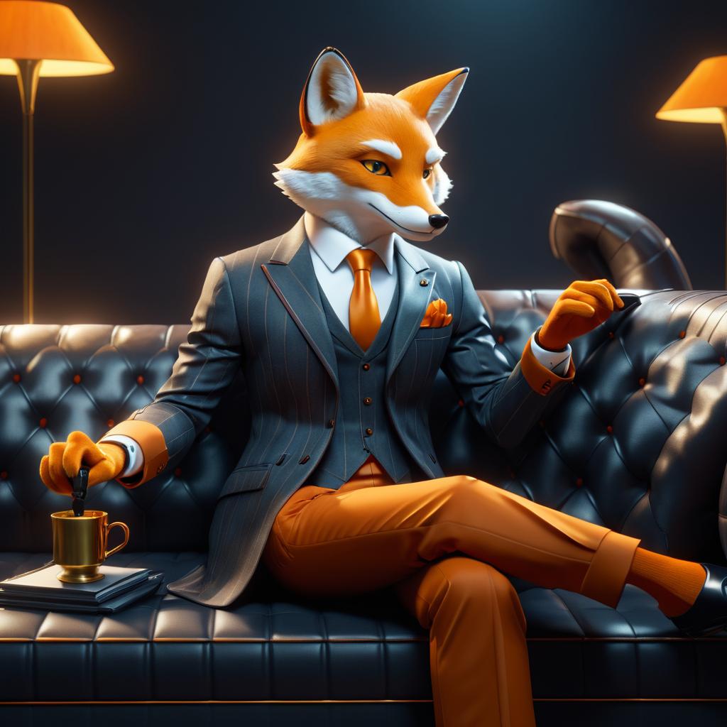 Highly detailed ultra-realistic portrait of a playful anthropomorphic fox dressed as a thief. The fox wears a shiny orange trench coat, a black vest, white shirt, and orange tie. It holds a gold and black wristwatch in black-gloved hands, under dramatic cinematic lighting. The stylized artwork echoes the influences of Kim Jung Gi and Katsuhiro Otomo.